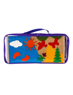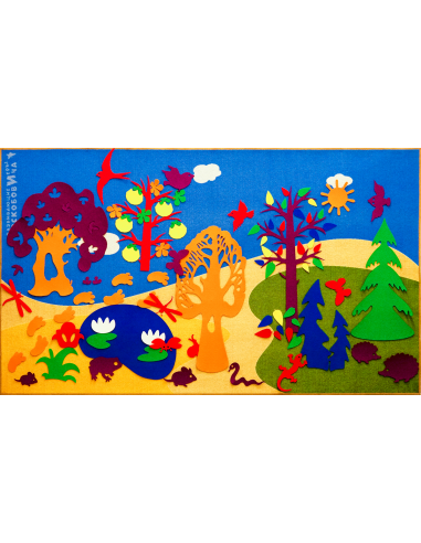 Поле - основа крепится к стене. Переносные модульные элементы из ковролина для крепления к основе: деревья, елки, озеро, солнышко, птицы, насекомые, листочки, плоды, облака, цветы, следы героя разного цвета.