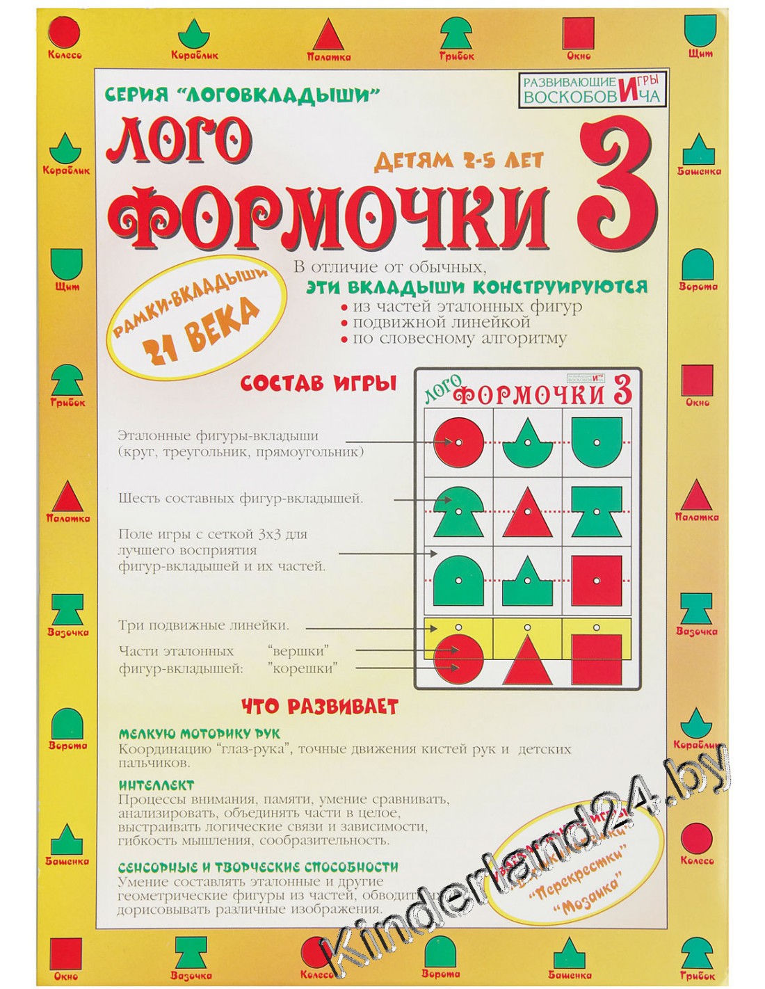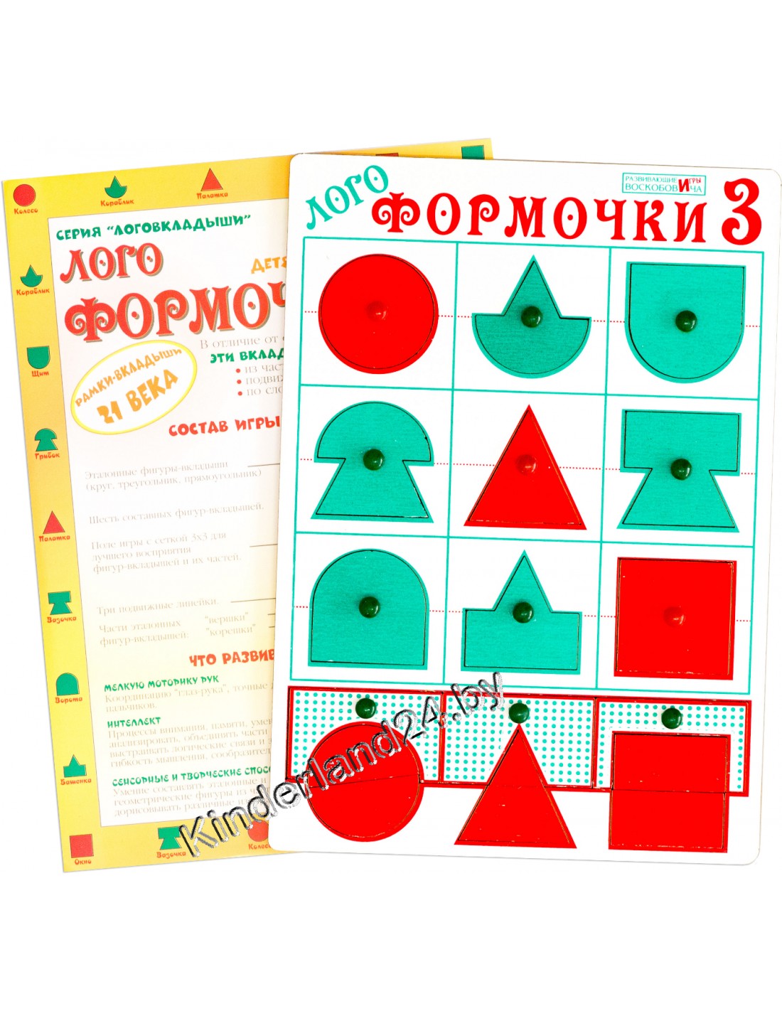 Логоформочки 3 - это логическая игра для закрепления знаний о геометрических фигурах и развитию образного мышления. Поле игры разделено на квадраты 3х3 и подвижную линейку, которая находится снизу. В комплекте есть 3 геометрические фигуры красного цвета – эталонные фигуры (круг, треугольник, квадрат) и 6 составных фигур зеленого цвета (они, получены в результате соединения верхней и нижней части эталонных фигур).