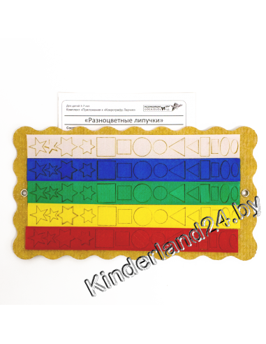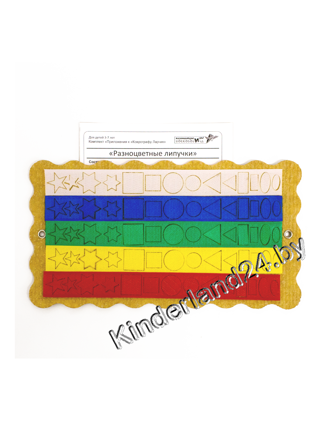 Фигуры выполнены из липкой ленты и легко крепятся на ковролиновую основу. Сама основа также может крепиться на вертикальную поверхность, благодаря липучкам с обратной стороны. Может использоваться во время игр и занятий с игровым полем развивающего пособия "Коврограф Ларчик".