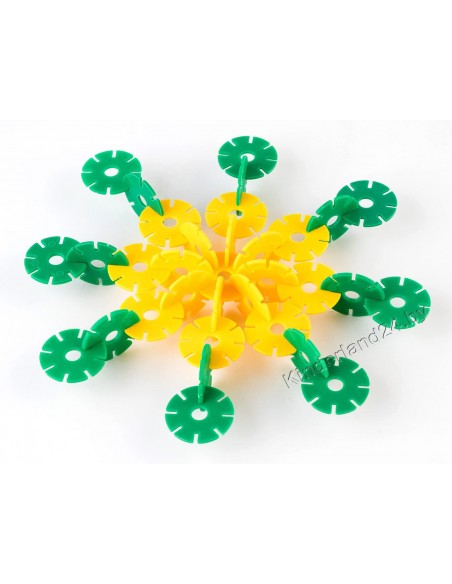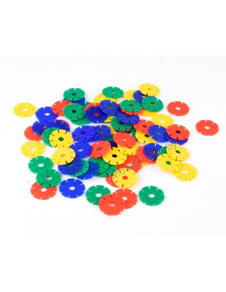 Игра состоит из круглых плоских фигур с прорезями для соединения. Фигуры четырех цветов (синий, зеленый, желтый, красный) в количестве 80 штук по 20 каждого цвета. (диаметр деталей 2,5 см.)
